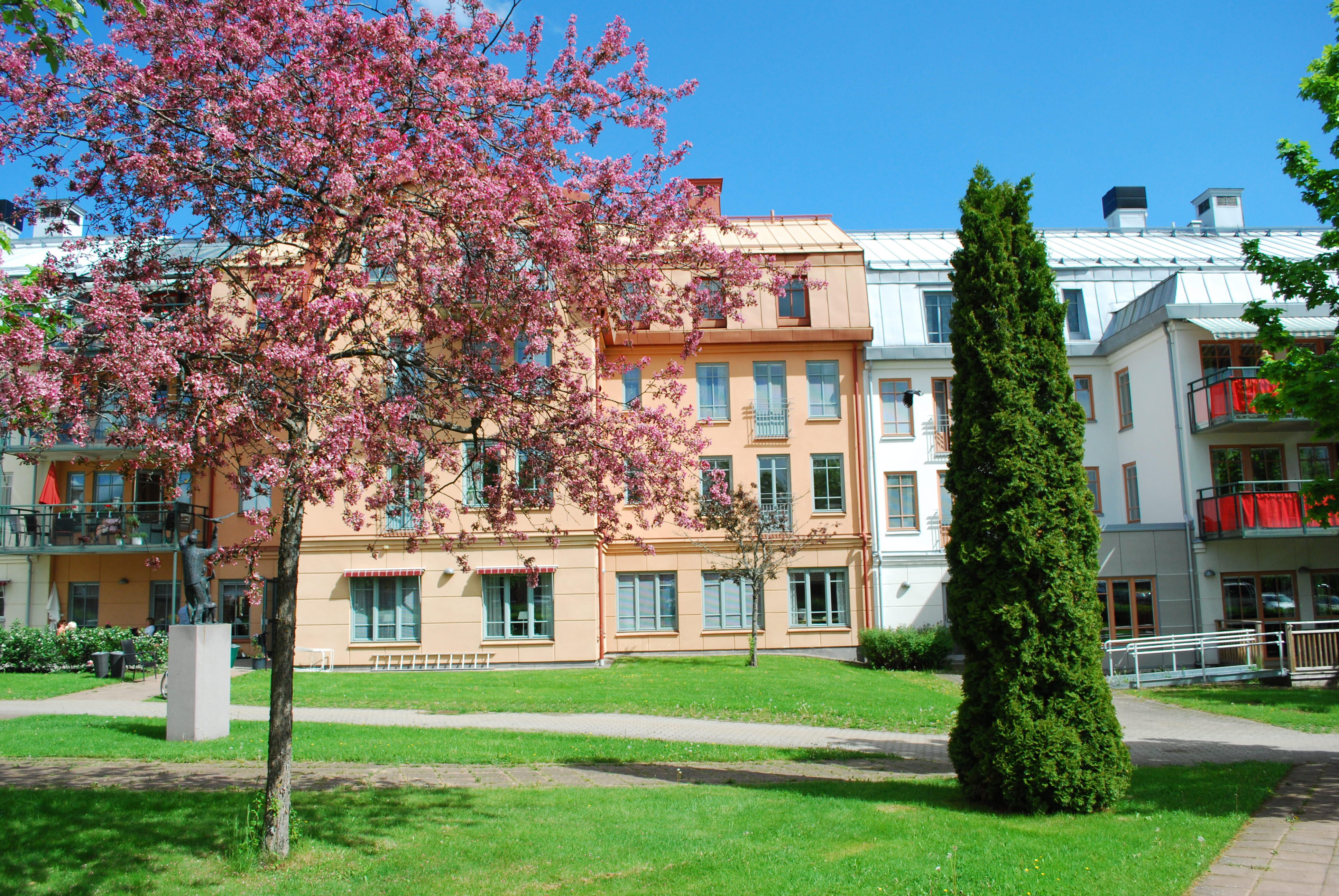 På Sallas bakgård finns en vacker trädgård med sittplatser och belagda gångar.